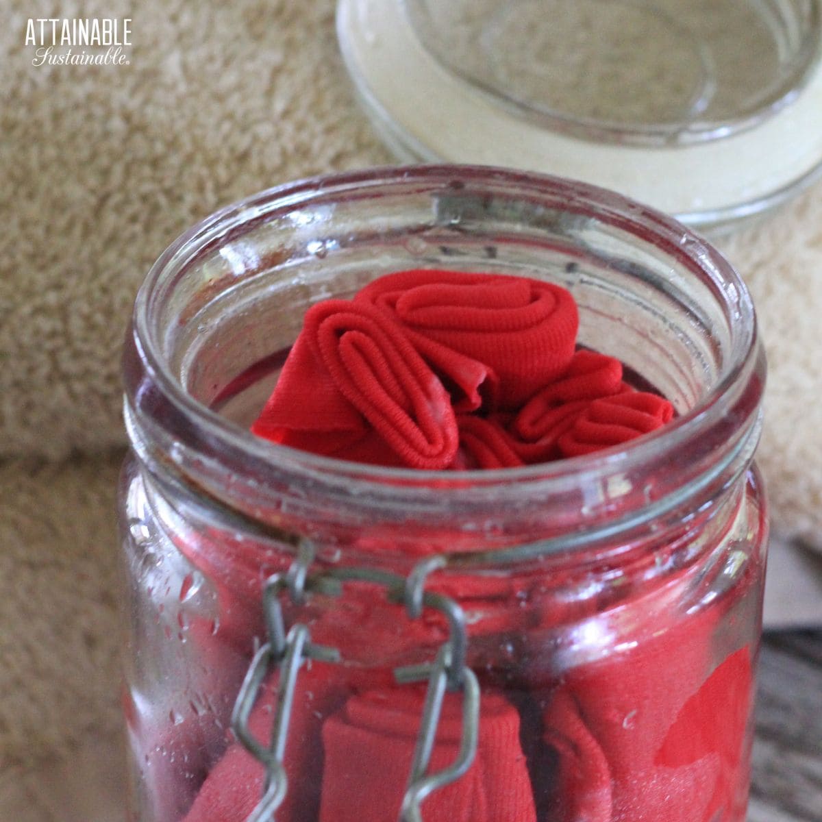 - Pour the vinegar solution into the jar, over all the pieces of fabric. Put the lid on the jar.